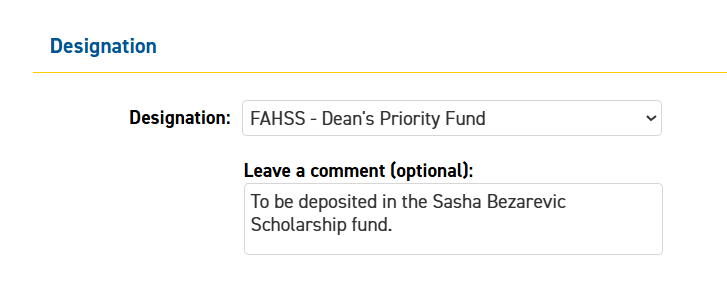 Make a DonationThe donation link will come up "FAHSS - Dean's Priority Fund" - this is correct. In the comment section, you must include " Sasha Bezarevic Scholarship" for it to be deposited in the right place.